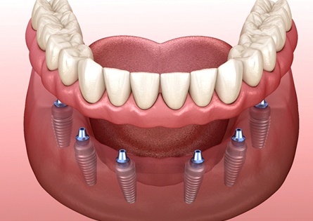 Implant-retained dentures are designed to restore your smile in its entirety and improve your oral health. This is accomplished by the implants continuing to stimulate your jawbone and prevent changes in your facial appearance as well as additional tooth loss. Once the implants (posts) are surgically placed into your jawbone (on average, your dentist will place between 4 and 6), you will return home to heal for a period of 3-6 months. Once you return, your denture prosthetic will be snapped into place, creating a permanent, long-lasting restoration.